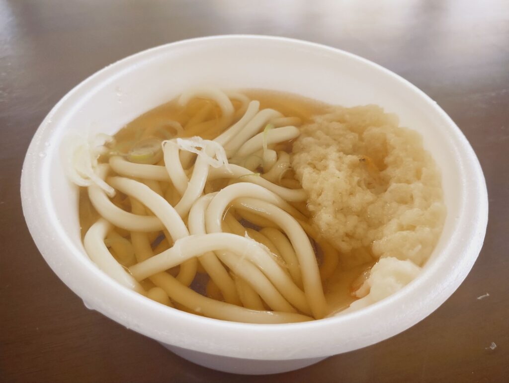 今回は、その中でも人気の「うどん」をチョイス。ボタンを押して待つこと約30秒、機械の中から「ガタン」と音を立てて出てくる発泡容器。蓋を開けると、湯気とともにやさしい出汁の香りがふわりと立ちのぼります。