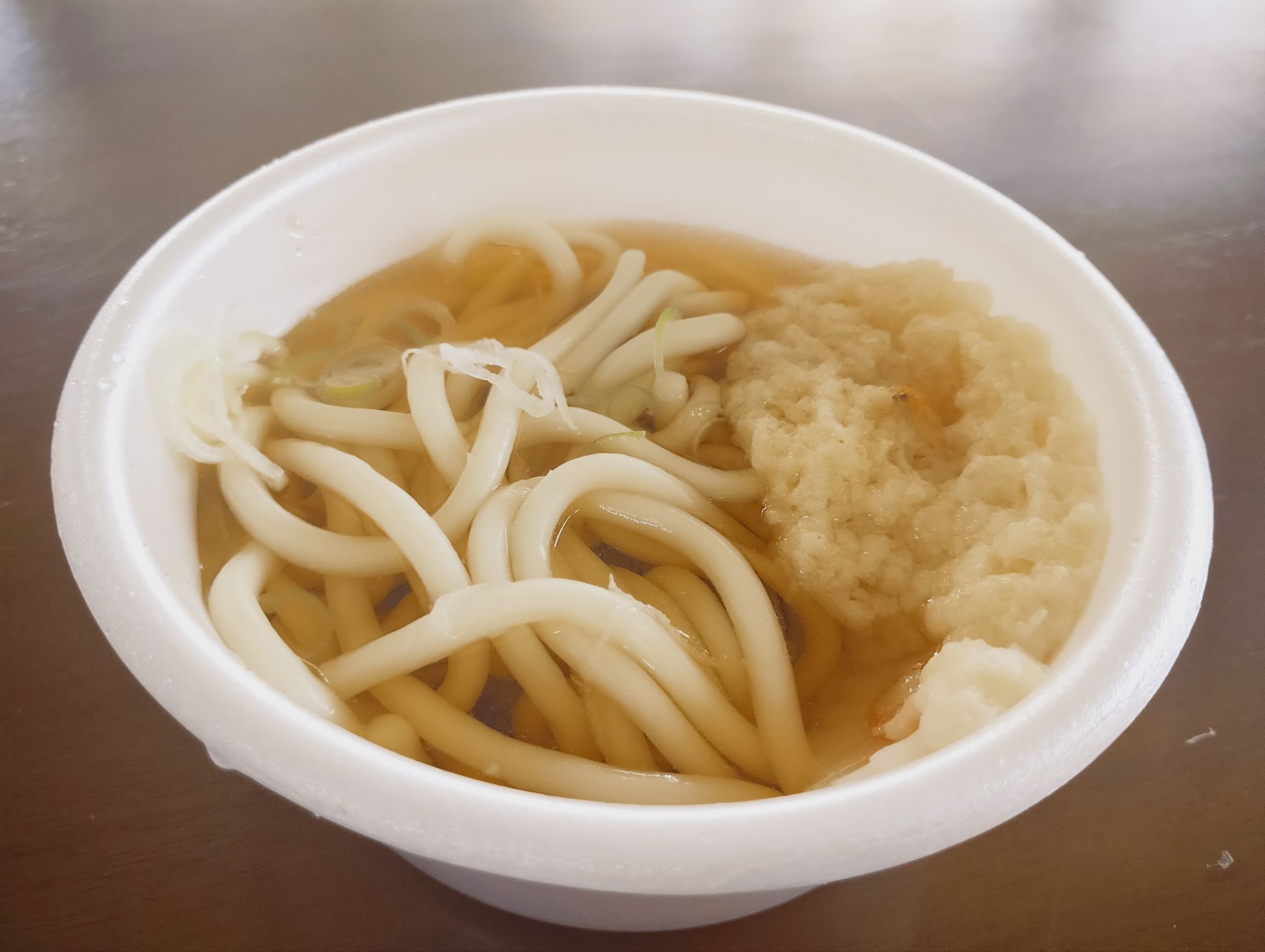 麺はふっくらとした太めのうどんで、ほどよいコシと柔らかさのバランスが絶妙。噛むたびに口の中でほろりとほどけ、どこか懐かしい味わい。出汁はあっさりとしていながらも、ほんのり甘みを感じる優しい味。天かすがスープに溶けていくことで、徐々にコクが増していきます。まさに昭和の味、素朴ながら心を満たしてくれる一杯です。