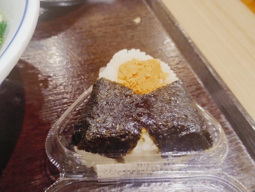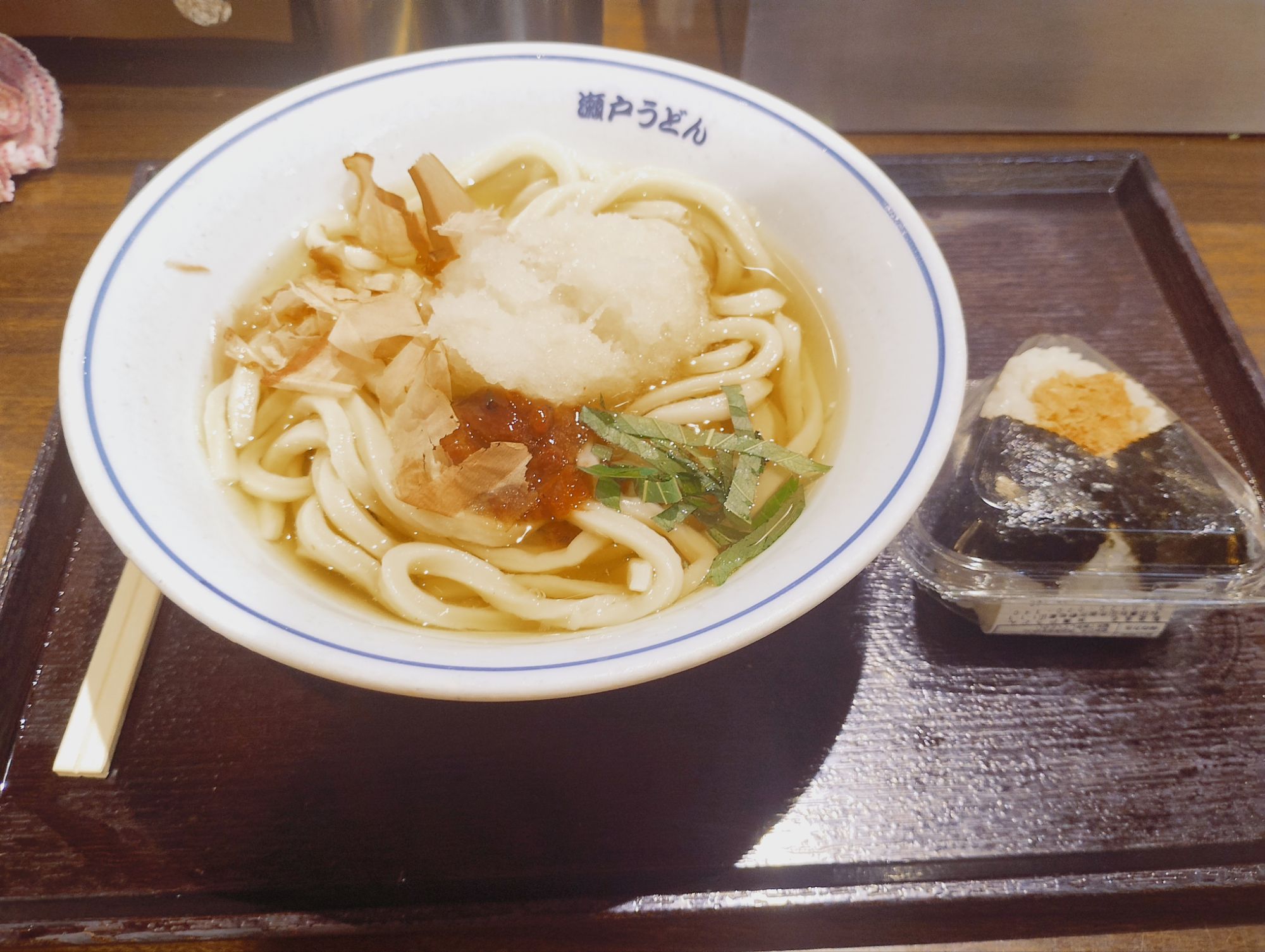 少し肌寒い日でしたが、以前から気になっていた「梅おろしうどん 冷がけ」をオーダー。流石にそれだけでは物足りないだろうと、「おにぎり(鮭)」も一緒に。