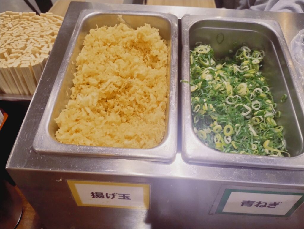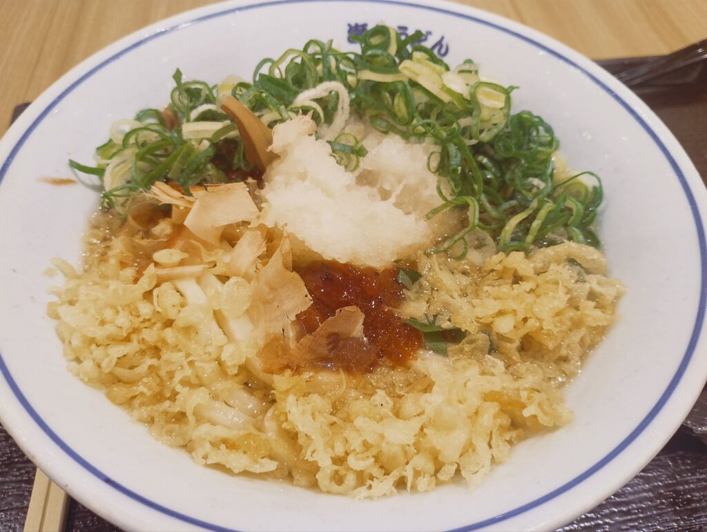 うどんが届いた瞬間、透明感のある出汁に梅の鮮やかな赤が映え、見た目にも爽やか。まずは大根おろしと梅を混ぜ、備え付けのネギと天かすをたっぷり投入。