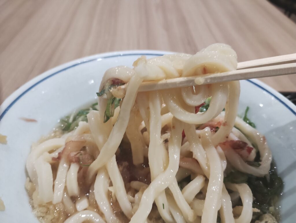 ひと口すすると、讃岐うどんならではのもっちりとしたコシと弾力が広がります。冷たい出汁の中に、梅の酸味とおろしの清涼感が絶妙に溶け合い、スッと体に染み渡る美味しさ。