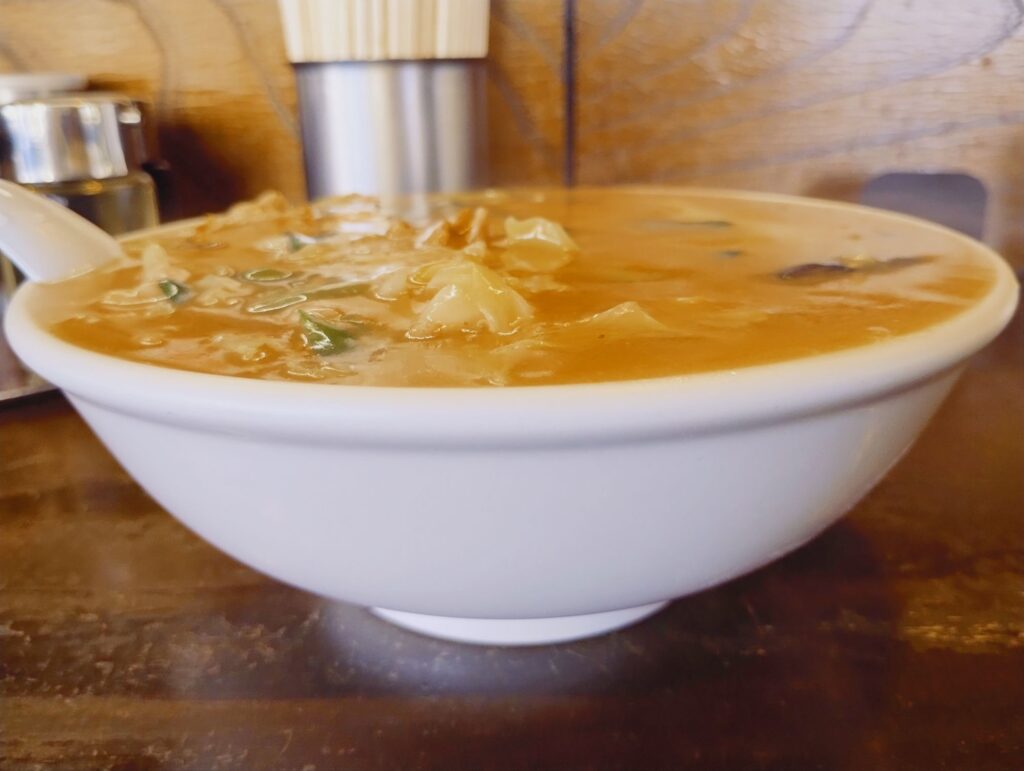 イカ・エビ・ベイビーホタテなどの魚介に、キャベツやもやしなどの野菜がたっぷり。餡の下から顔をのぞかせる具材たちが、味噌スープに豊かな旨みを与えています。濃厚ながらもどこか優しさを感じる味わいで、魚介と野菜の出汁が見事に調和。