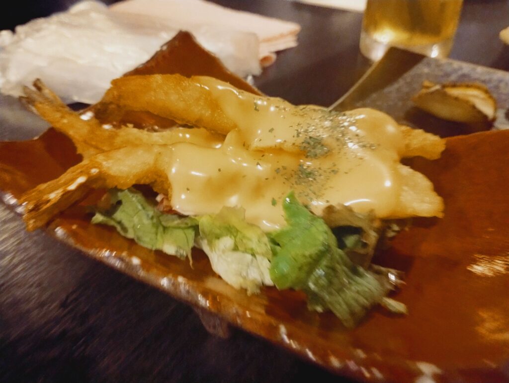テーブルには厚焼き玉子、いぶりがっこチーズ、タコ唐、モロキュウ、エイヒレ、焼き鳥の皮と軟骨、エビフライ、唐揚げ、ポテトサラダ、砂肝、カキフライ、もつ煮…と、まさに“酒の友”がずらりと並びました。