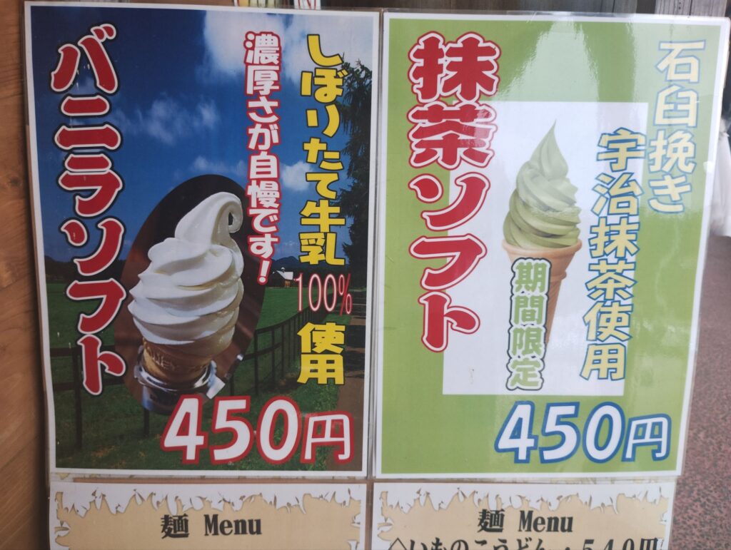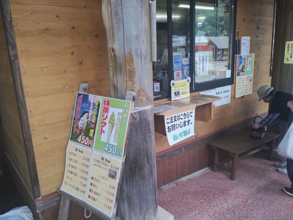 店内での食事ではなく、店頭で受け取って道の駅の共有スペースでいただくスタイル。ソフトクリームやうどん、そば、ラーメンなどが手軽に楽しめる人気スポットです。