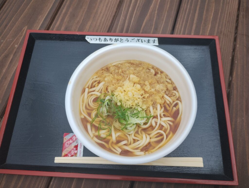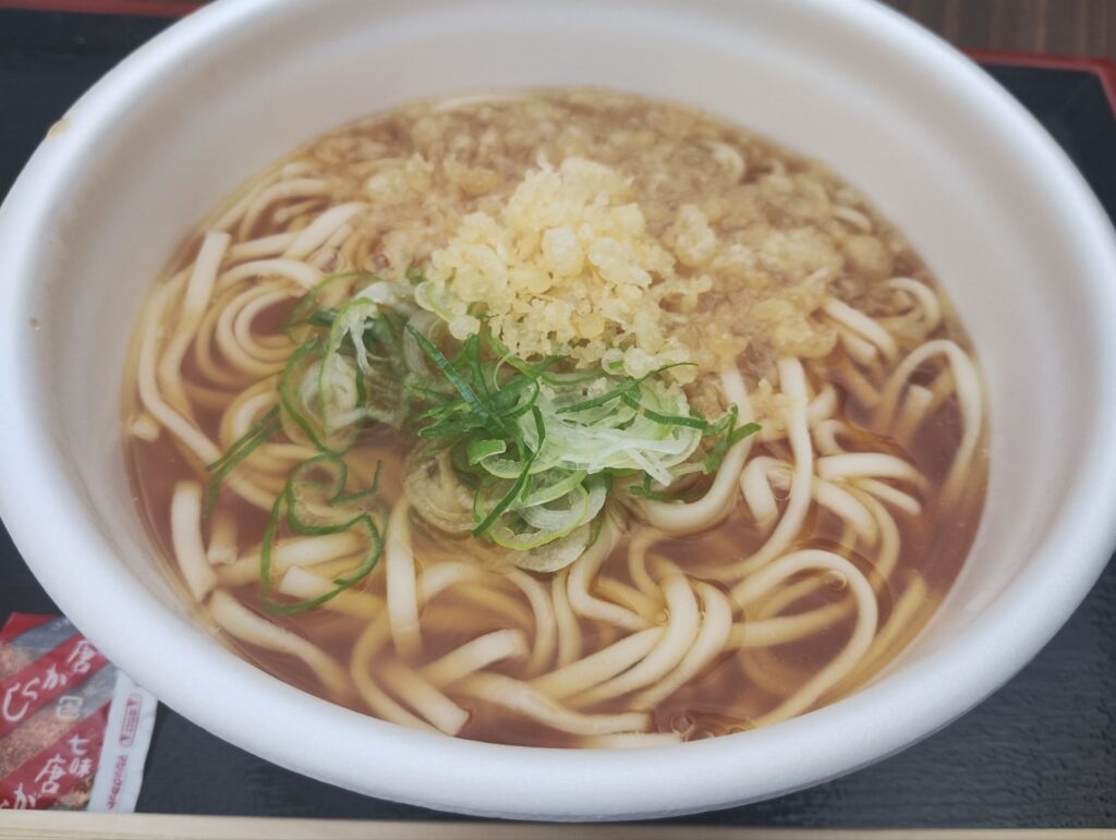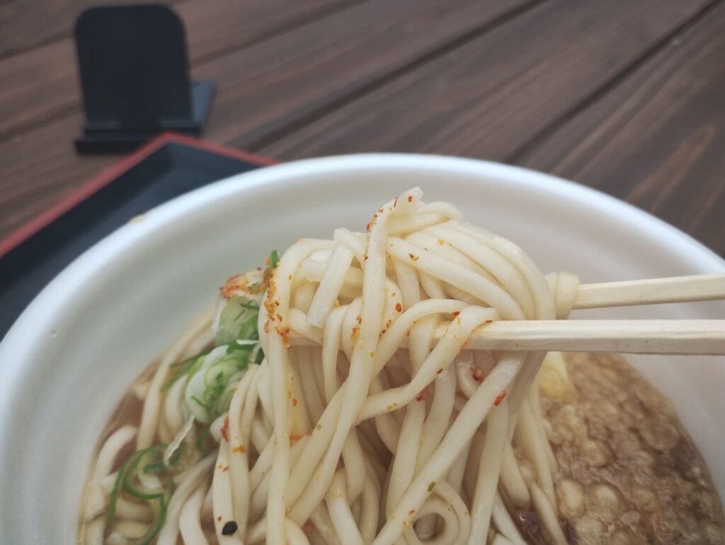 スープは少し塩っぱめの醤油味で、どこか懐かしい素朴な味わい。トッピングは長ネギと天かすのみとシンプルですが、それがまた麺とスープの良さを引き立て、飽きのこない美味しさに。
