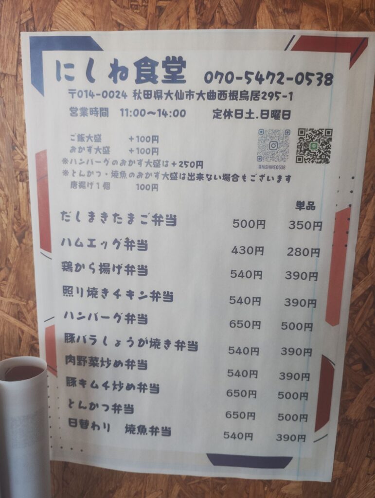 大仙市大曲西根にある「にしね食堂」さん。経営者が横手市の人気居酒屋「粋場」さんに変わり、現在はテイクアウト専門店として営業中です。