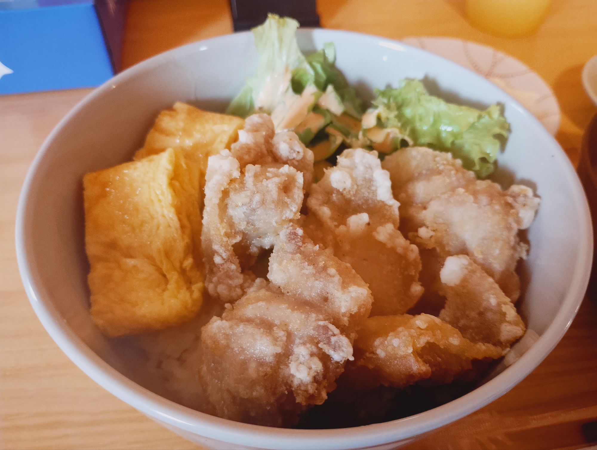 メニューは潔く一種類「ランチセット」のみ。この日の内容は「唐揚げセット」 シンプルな構成ながら、丼いっぱいに盛られた大きめの唐揚げは存在感たっぷり。副菜の卵焼きとレタスが彩りを添え、見た目から食欲をそそられます。