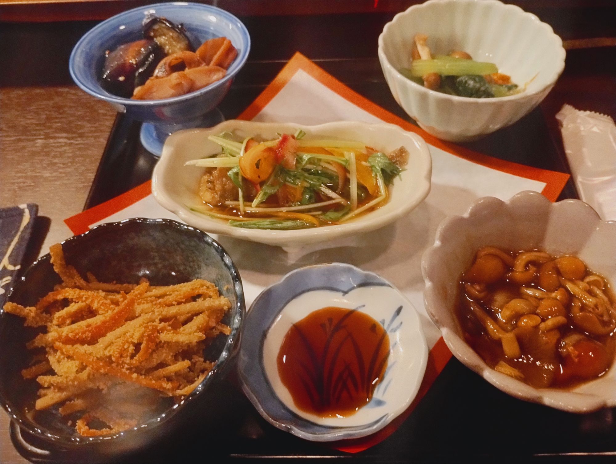 店内に案内されてまず驚いたのが、小鉢の数。きんぴら、酢の物、なめこ、煮物、お浸しがテーブルいっぱいに並び、その彩りとボリューム感に思わず歓声が上がるほど。ひとつひとつ丁寧に作られた優しい味わいで、これだけで日本酒が進むのは間違いありません。