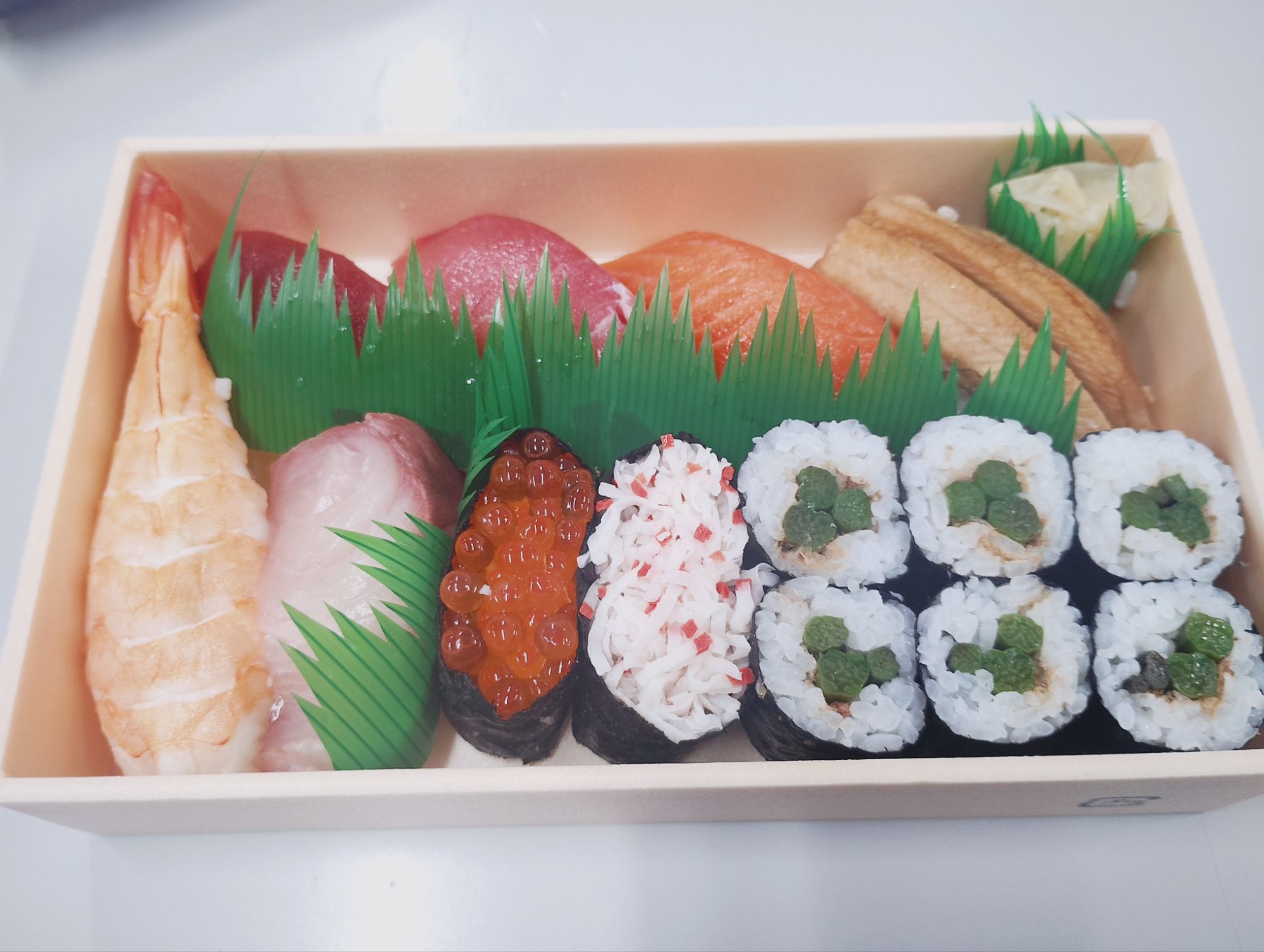 普段は夜のみ営業で、昼は予約のみ対応。この日は事前に「おまかせの持ち帰り」をお願いし、受け取った瞬間から胸が高鳴ります。いざフタを開けると、その豪華さに思わず声が出るほど。マグロの赤身と中トロ、サーモン、穴子、蒸しエビ、はまち、いくら、蟹身ほぐし、そして海苔巻き。どれも輝くように新鮮で、職人技が詰まった一貫一貫から磯の香りと食材の旨味がはっきりと伝わってきます。