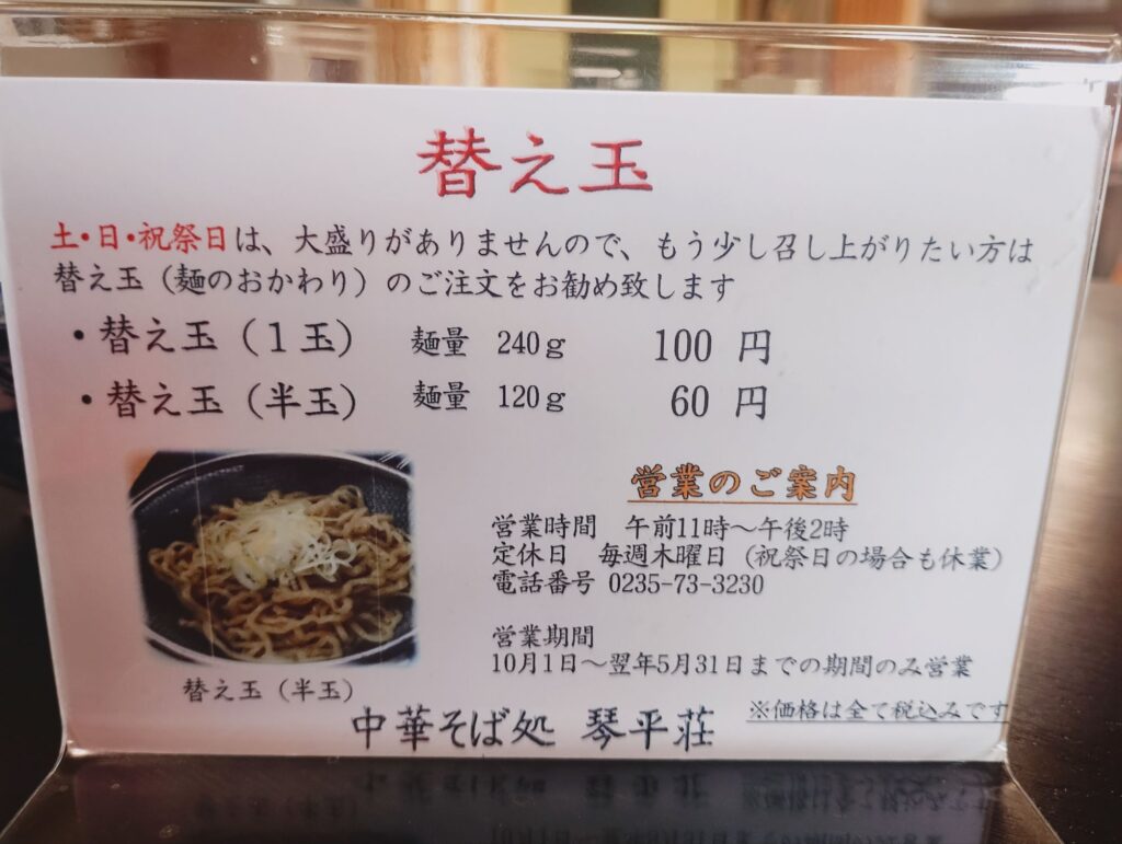 場所は、〒999-7463 山形県鶴岡市三瀬巳381−46に有ります。。駐車場は、店舗周りに30台ほど。座席は、4人がけテーブル12席。営業時間は、11:00(土日祝は10:30)~14:00で木曜定休です。仕込みに入る6月~9月は休店しますのでご注意を!