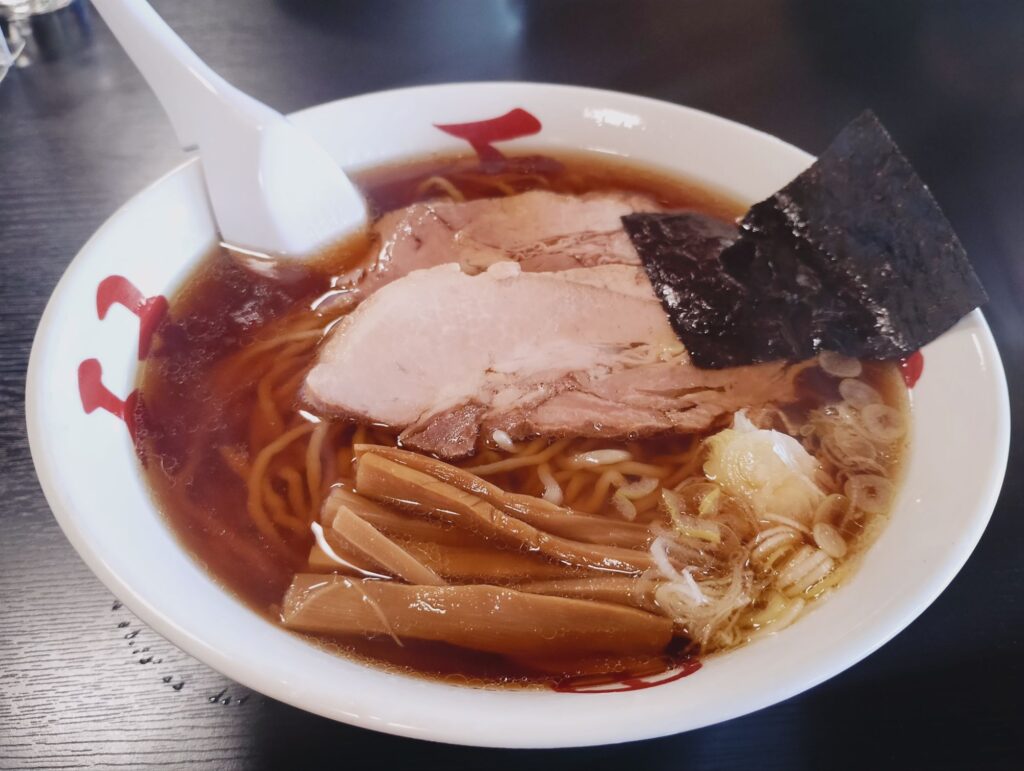 運ばれてきた中華そばは、いつも通りの濃厚な醤油スープの中央にチャーシューとメンマ、そして端に寄り添う海苔が美しく整列。