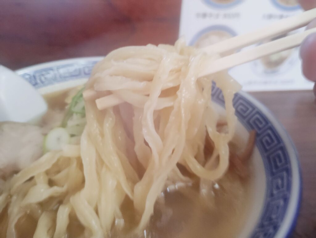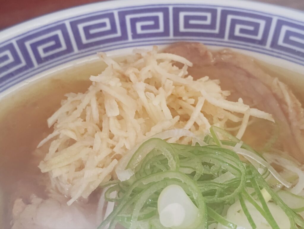 スープは、アゴ出汁の旨味がしっかりと感じられるキレのある塩味。あっさりとしながらも深みがあり、太麺との相性は抜群。そこに季節限定の新生姜が加わることで、爽やかな香りと心地よい辛味がアクセントとなり、体の内側からじんわり温めてくれるような味わいです。生姜=味噌という固定観念が覆されるほど、塩スープによく馴染みます。
