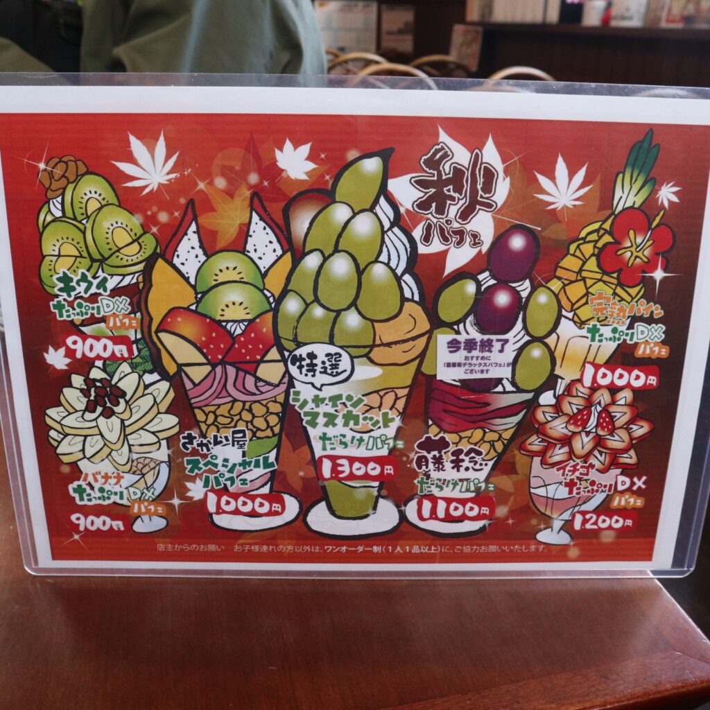 そして、この「さかいや」さんが特に人気なのは、併設されたパーラーの存在。季節の果物をふんだんに使ったパフェが名物で、休日には行列ができるほど。