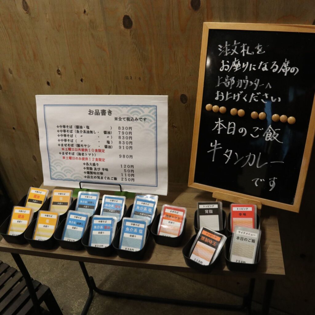 まず面白いのがオーダー方法。メニューを見て、カウンター下に並ぶ「メニュー札」を自分で取って提示し、会計時はその札をホルダーごとレジに持っていく独自スタイル。初訪問でも分かりやすく、遊び心のあるシステムです。