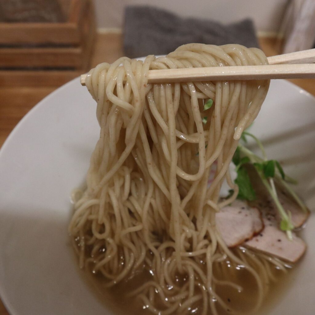麺は石臼挽きの小麦を使った全粒粉のストレート細麺。細麺とは思えないほど歯応えがしっかりしており、力強いスープとの相性も抜群。麺自体の風味も感じられ、スープに負けない存在感を放っています。