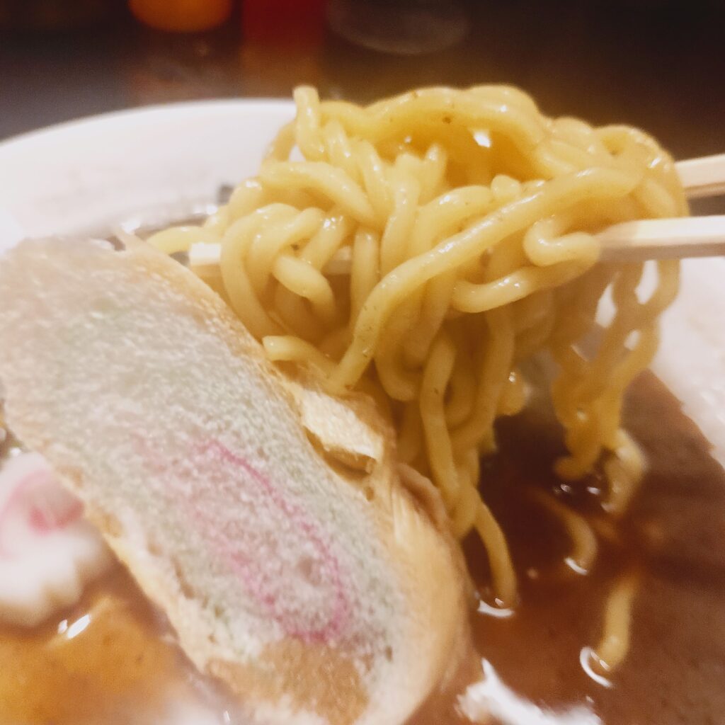 麺は太めの縮れ麺で、強烈な煮干しスープをしっかり持ち上げてくれる頼もしい存在。モチモチの食感と噛み応えが心地よく、スープとの一体感が抜群です。