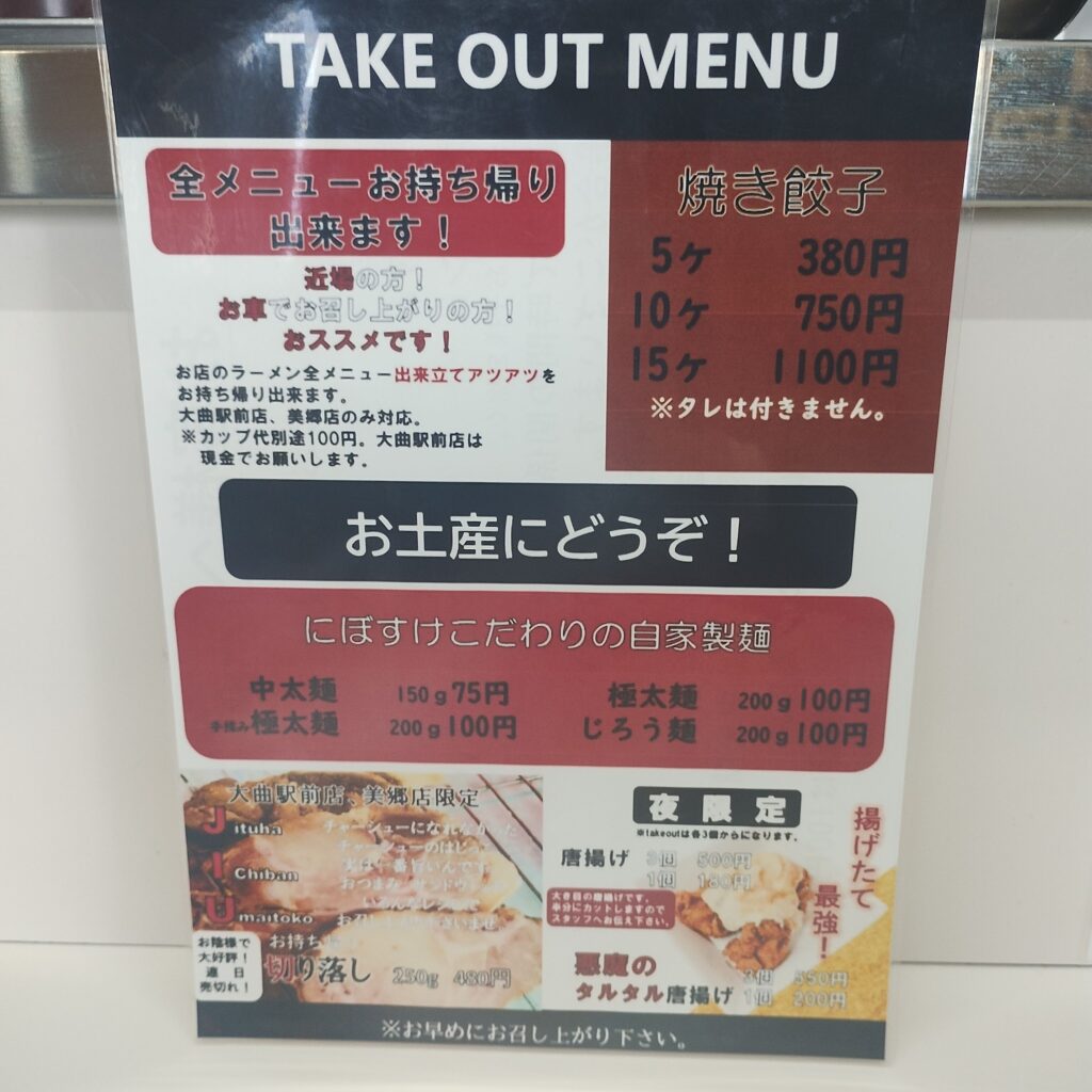 場所は、〒019-1404 秋田県仙北郡美郷町六郷熊野133−3に有ります。駐車場は、店舗前に14台ほど。座席は、カウンター6席・2人がけテーブル2席・4人がけテーブル1席・小上がりに2人がけ座卓2卓・4人掛け座卓2卓。営業時間は、11:30〜15:00・17:00〜21:00で火曜定休。