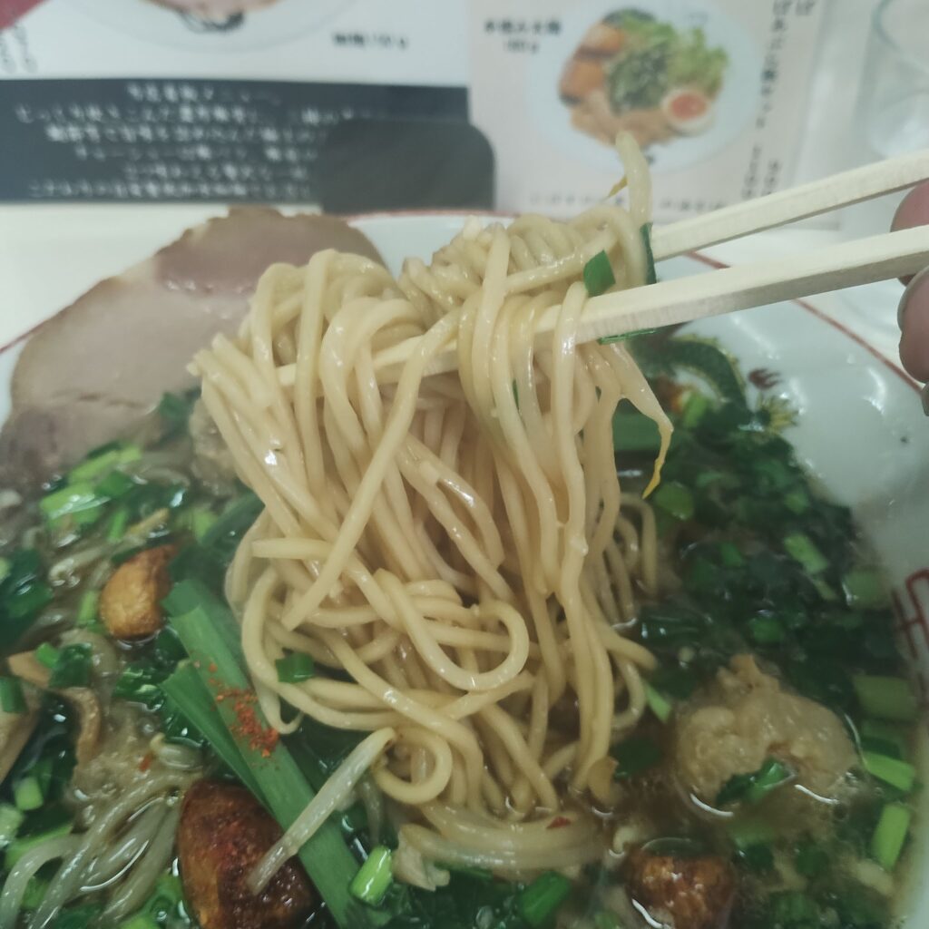 スープをひと口。見た目のインパクトとは裏腹に、辛さは控えめ。主役はあくまで煮干しの強烈な出汁です。そこにニラ特有のほろ苦さと程よい辛味が重なり合い、煮干しの旨味をさらに引き立てる仕上がり。これは定番メニューになるのも納得の完成度です。
