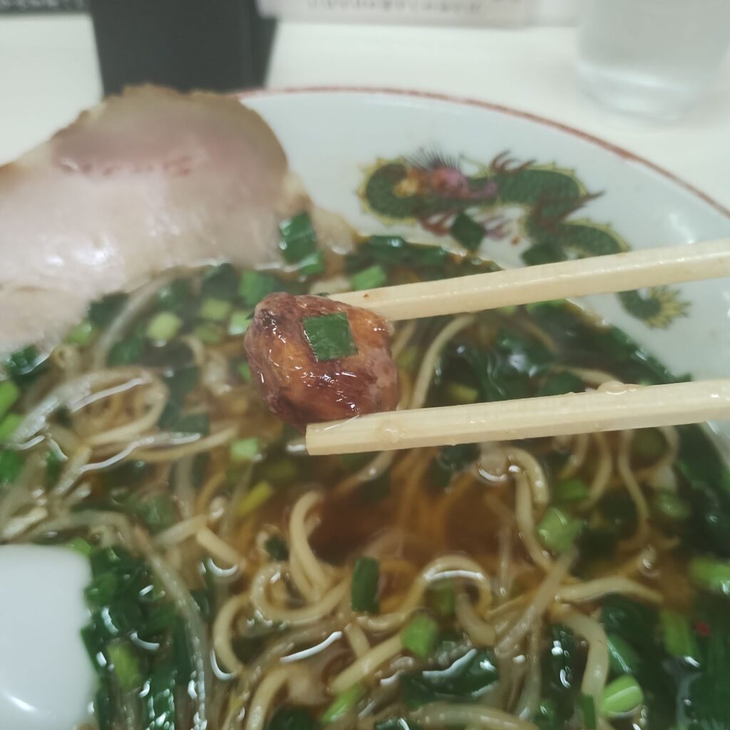 そして、この一杯をより個性的にしているのがトッピング。チャーシューかと思いきや、実はホルモンのシマチョウ。柔らかさの中にコリコリとした独特の食感があり、煮干しスープとの相性も抜群です。さらに揚げニンニクが加わり、ホクホクとした食感とほんのり感じる辛味がアクセントに。火が通っているため匂いも気にならず、全体の完成度を高めています。