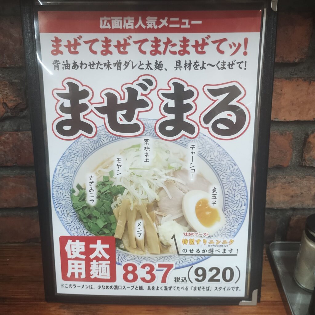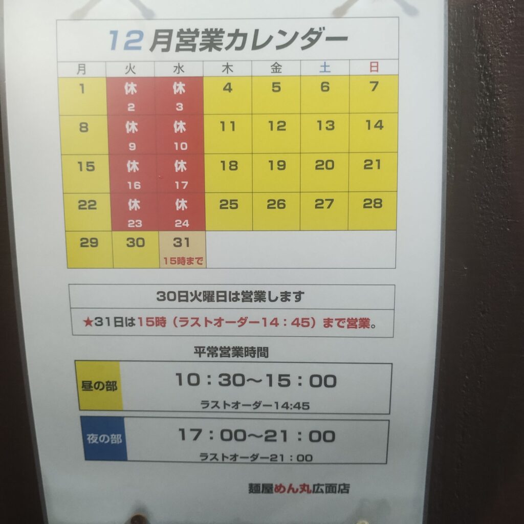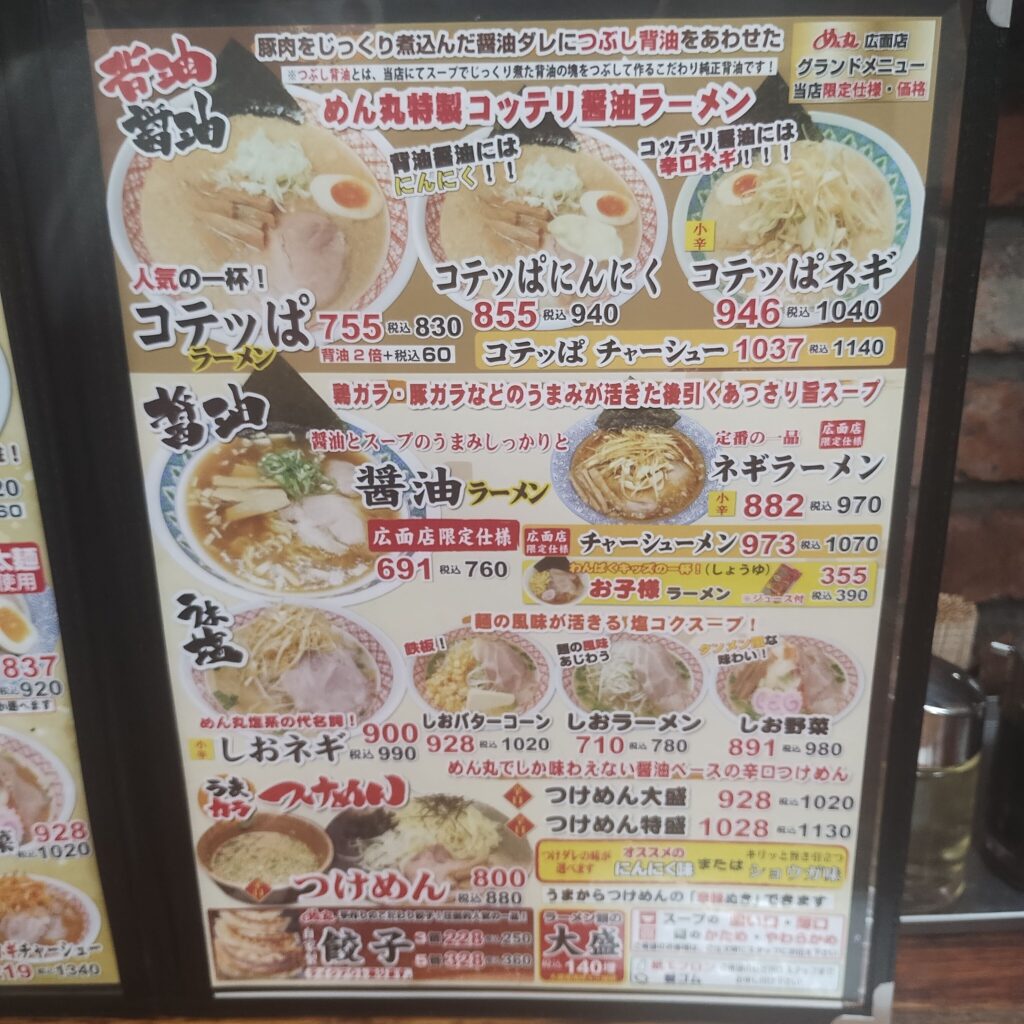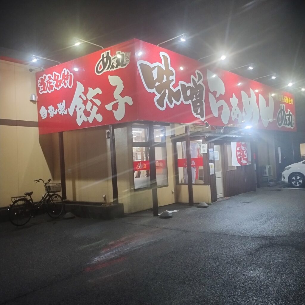 この日はバスケット観戦のあと、少し早めの晩ご飯へ。日曜日ということもあり、目当てのお店は定休日が多く、なかなか行き先が決まらない。そんな中、ふと目に入ったのがラーメンチェーン店「めん丸広面店」さんでした。