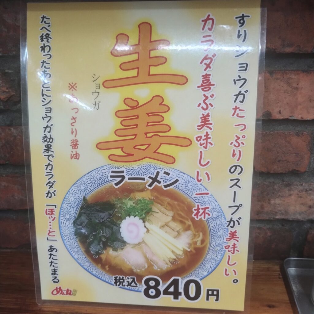 店内でメニューを眺めると、その種類の多さにしばし迷います。そんな中、この時期にぴったりな「生姜ラーメン」を発見。冷えた体を中から温めたい気分でもあり、迷わずオーダーしました。