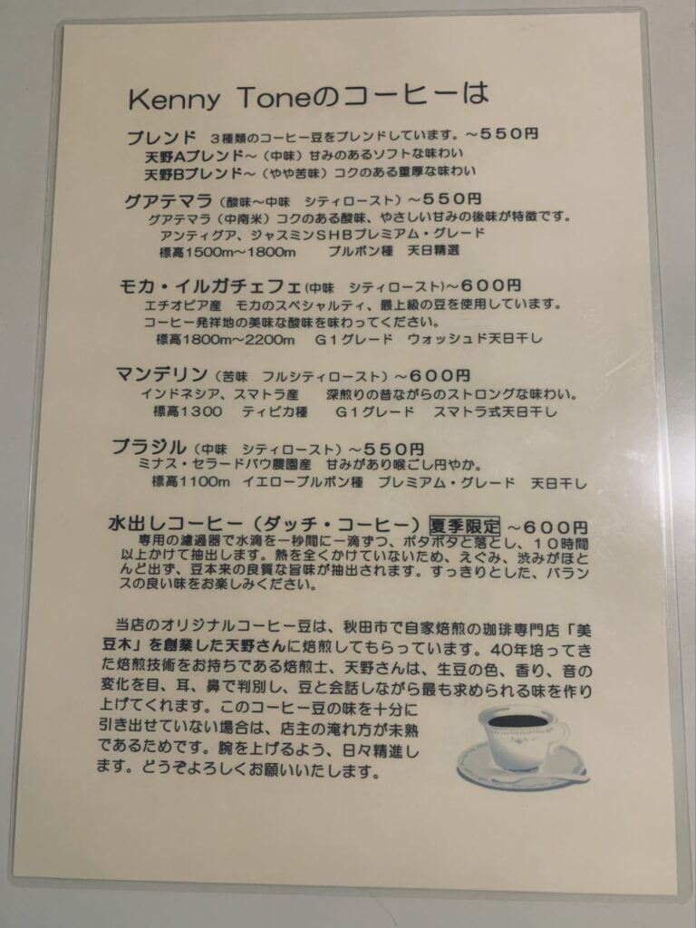 夏季限定で「水出しコーヒー」も提供しているとのこと。次回は季節を変えて、また違った表情の「ケニー・トーン」さんを味わってみたいと思います。角館で、静かに大人の時間を過ごしたい方におすすめの一軒です。
