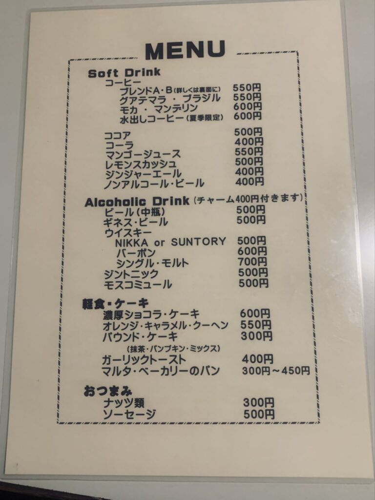 オーダーしたのは「天野ブレンドB」 3種類の豆をブレンドしたコーヒーで、メニュー表には「コクがあり、やや苦みのある濃厚な味わい」との説明。普段はインスタントコーヒーが中心の私でも、ひと口飲んだ瞬間にコクと苦みのバランスの良さをはっきりと感じました。派手さはありませんが、じっくりと味わいたくなる一杯です。