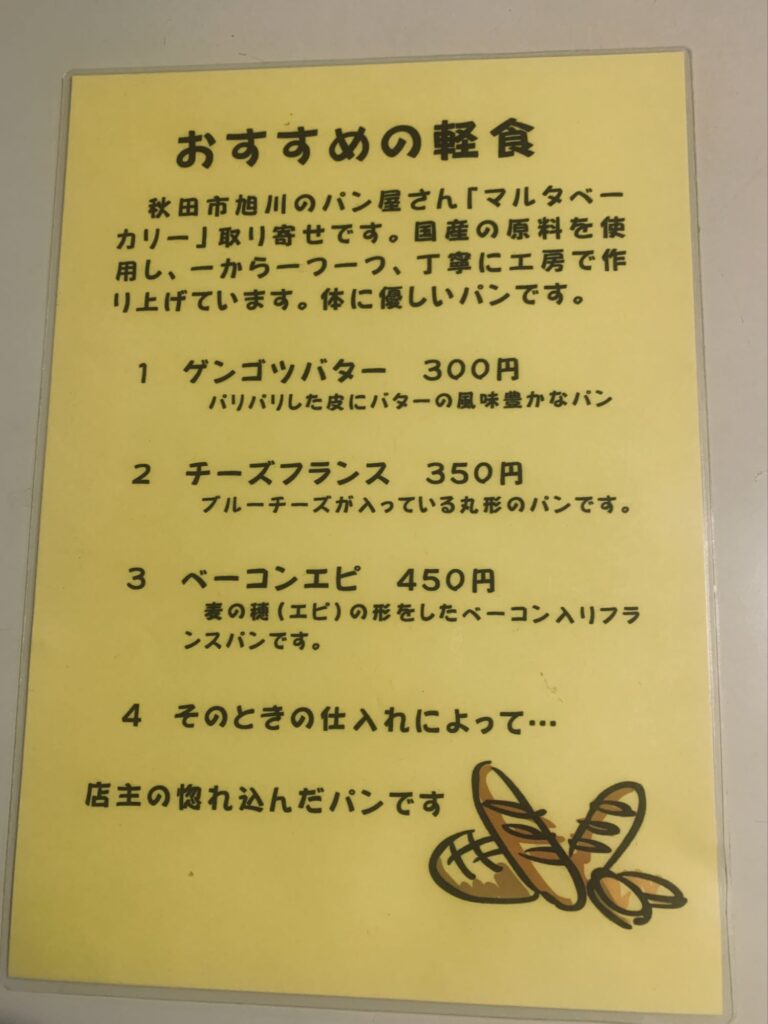 場所は、〒014-0369 秋田県仙北市角館町上菅沢265−3に有ります。駐車場は、少し離れたところに7台ほど。座席は、カウンター4席・4人がけボックス4席。営業時間は、14:00〜21:00で水木定休。