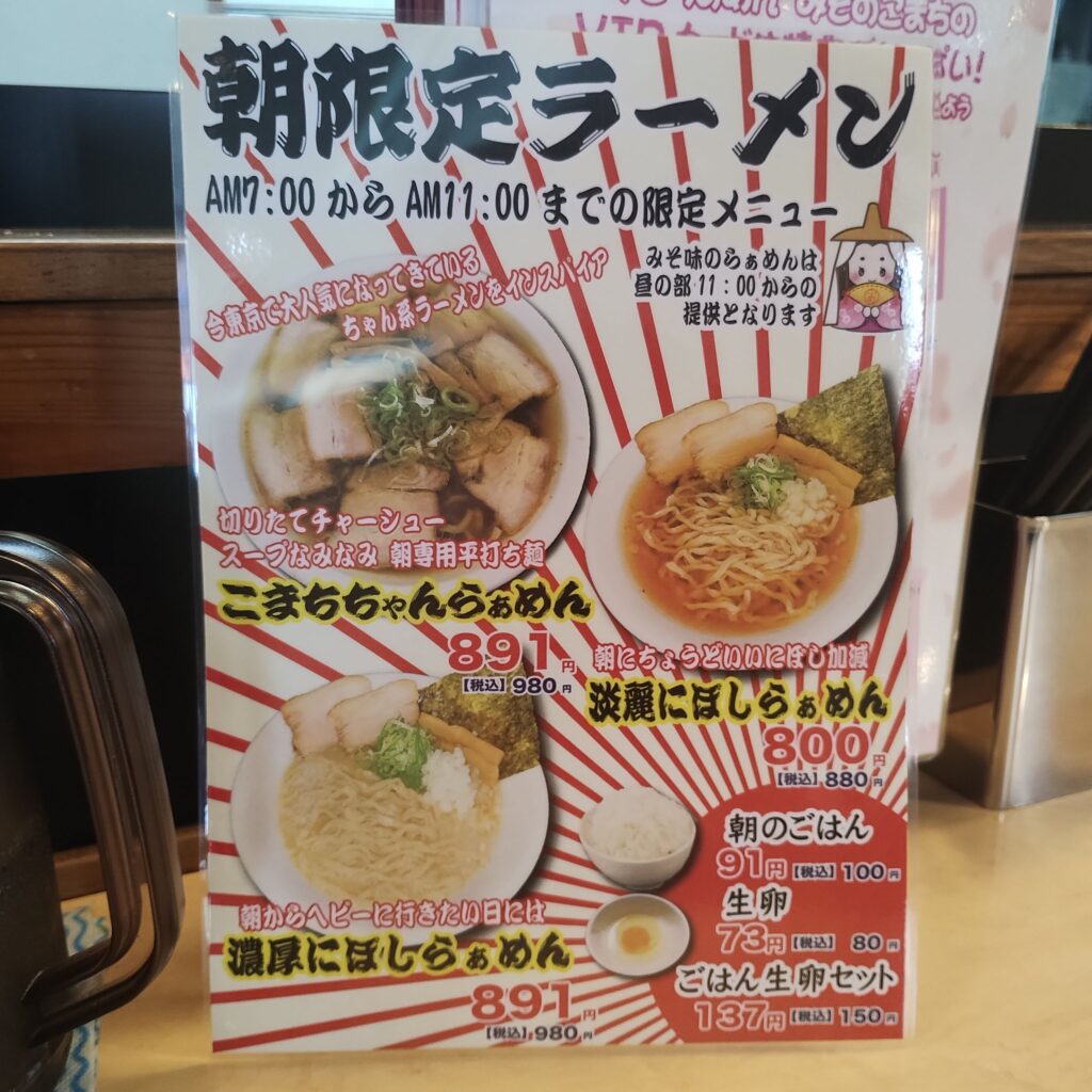 場所は、〒010-0951 秋田県秋田市山王1丁目3−16に有ります。駐車場は、店舗前と向かいで10代。座席は、カウンター7席・4人がけテーブル8席。営業時間は、7:00〜15:00・17:00〜21:00(夜営業は土日祝のみ)で不定休。