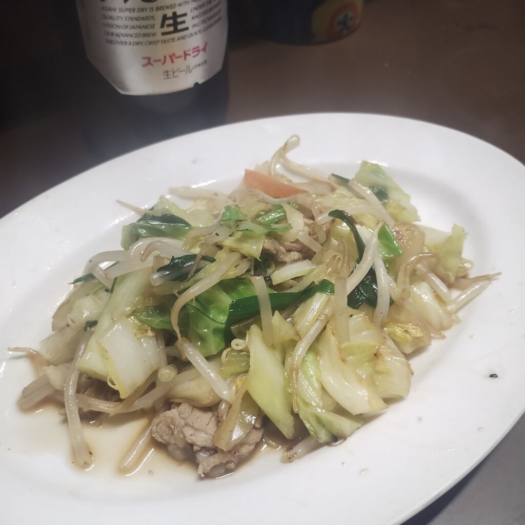 最初に出てきた野菜炒めが、これまた秀逸。塩コショーの加減が絶妙で、ビールが進む進む。