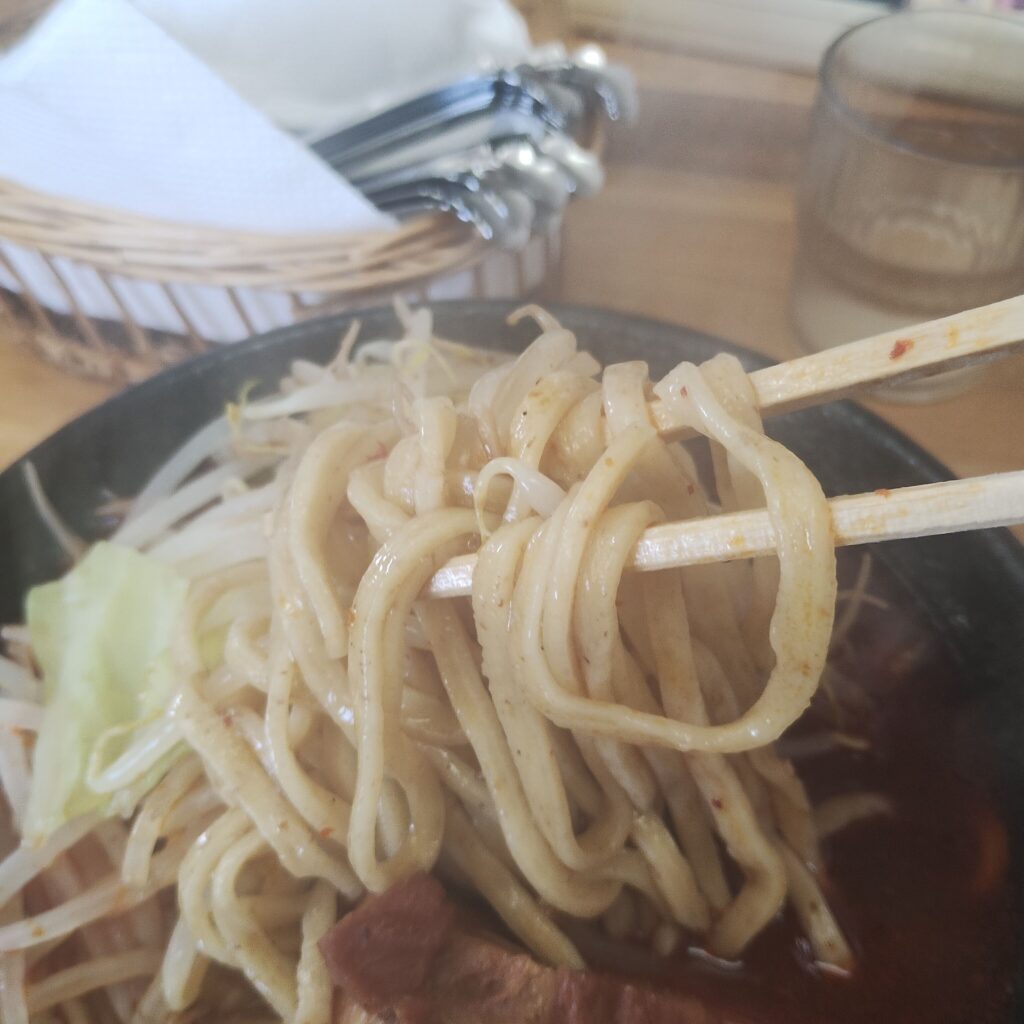 極太縮れ麺は、強烈なスープにも負けない存在感。もちもち食感でスープをしっかり絡め取り、噛むほどに麺の旨さを感じられます。