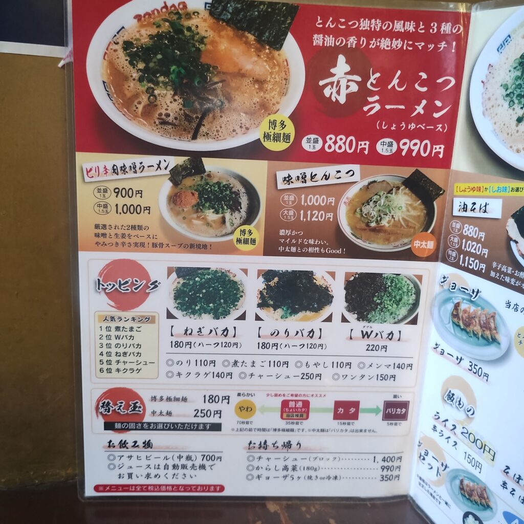 メニューは醤油ベースの赤とんこつと、塩ベースの白とんこつ。悩んだ末、今回は「白とんこつ」を選択しました。