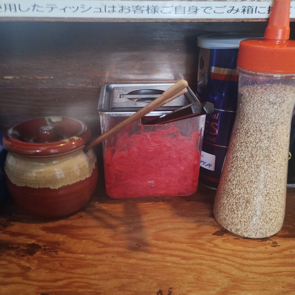 半分ほど食べ進めたところで、紅生姜とにんにくを投入。紅生姜の独特な辛味と風味、にんにくのパンチが加わり、一気に別の表情へ。体の内側からじんわり温まっていく感覚も、豚骨ラーメンならではです。