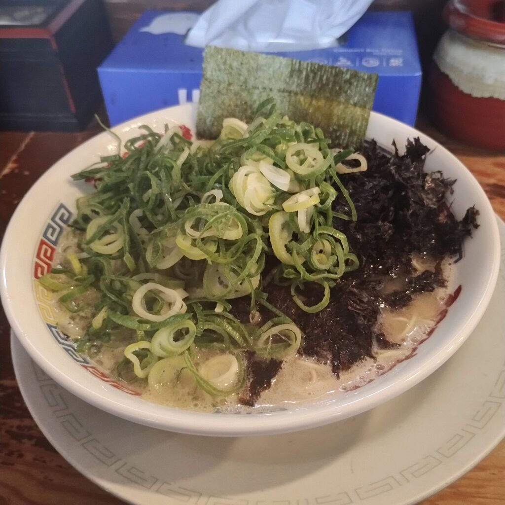 トッピングは、ねぎとのりをたっぷり盛ってくれる「Wバカ」を。シャキシャキ食感のネギに、塩とんこつスープと相性抜群の磯海苔。この組み合わせだけで、すでに期待が高まります。
