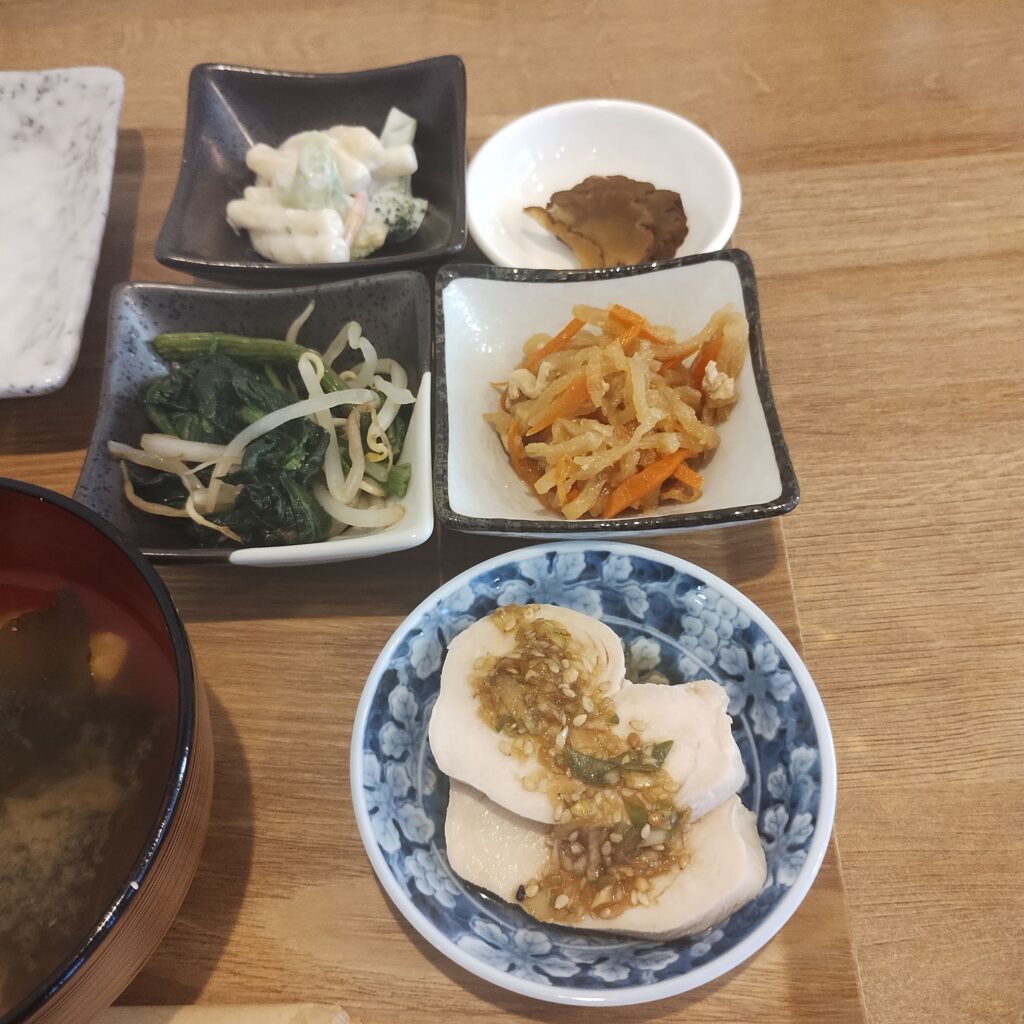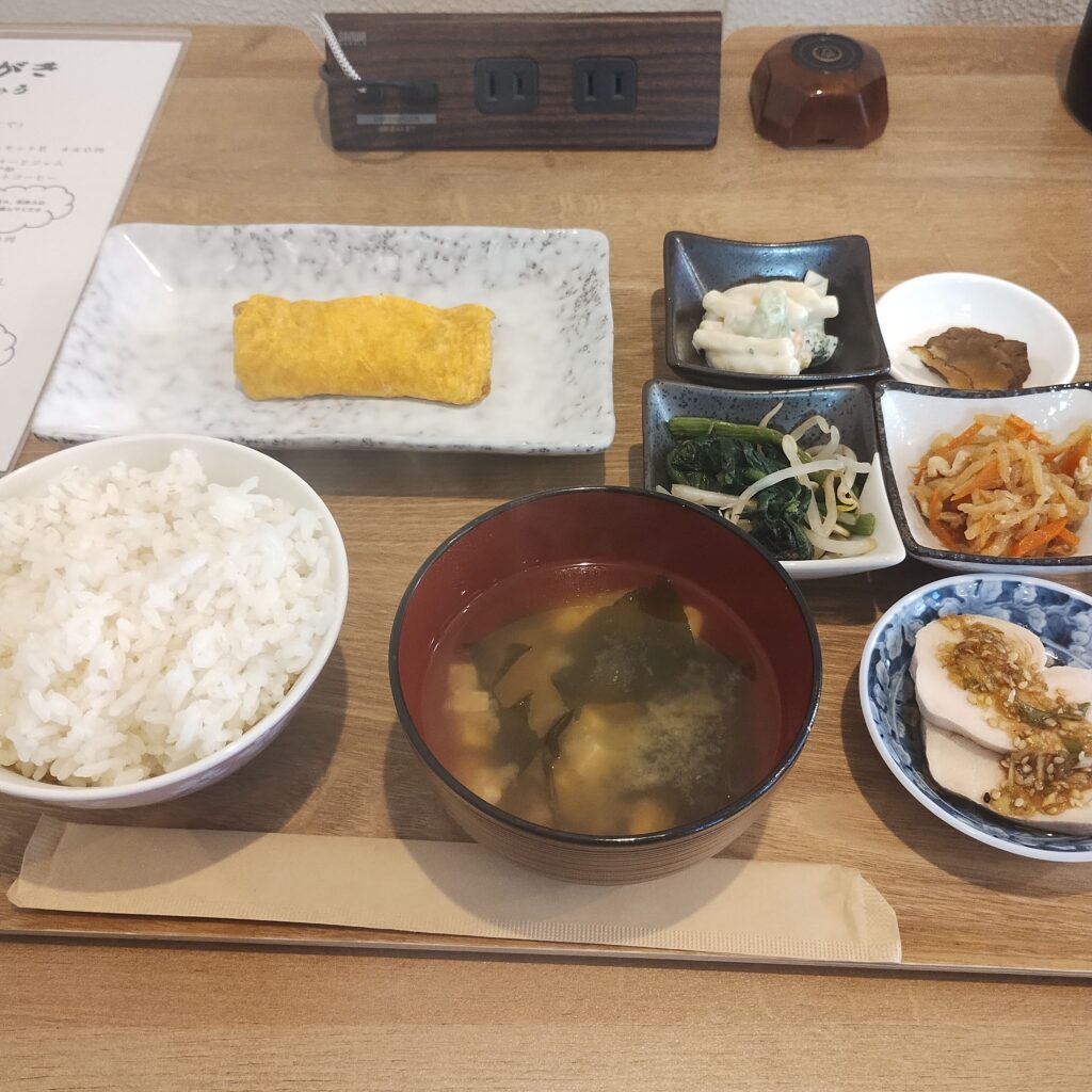 配膳されてまず驚いたのは、その品数。卵焼き、ご飯、味噌汁、お新香に加え、小鉢が四品も付いてきます。メニュー表を見返すと、しっかり記載されており、納得の内容です。
