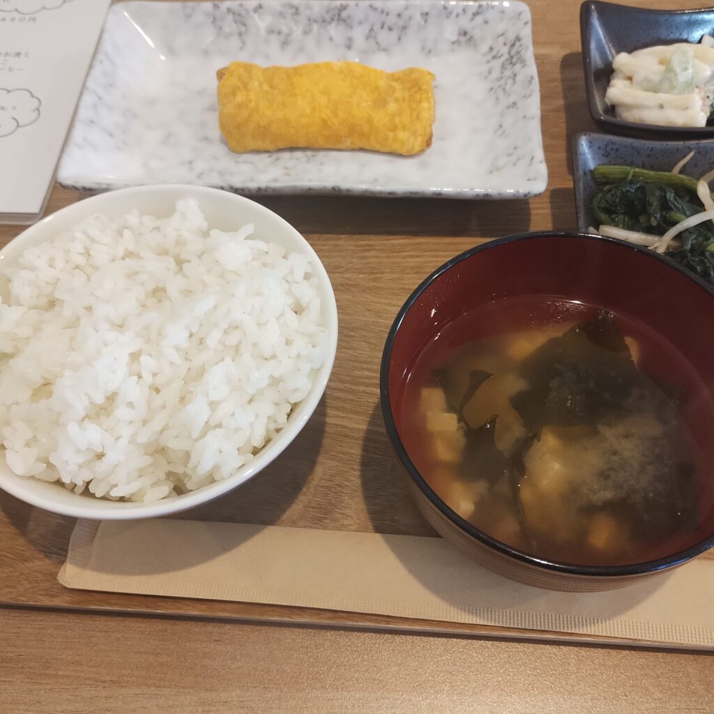 主役の卵焼きは、ほんのり甘くふんわりとした焼き加減。朝の体に優しく染み込む味わいです。鶏ささ身の餡かけはヘルシーで食べやすく、ほうれん草とモヤシのお浸し、大根と人参の煮物、マカロニサラダと、副菜のバランスも見事。栄養面を意識した内容で、自然と体が整っていく感覚があります。