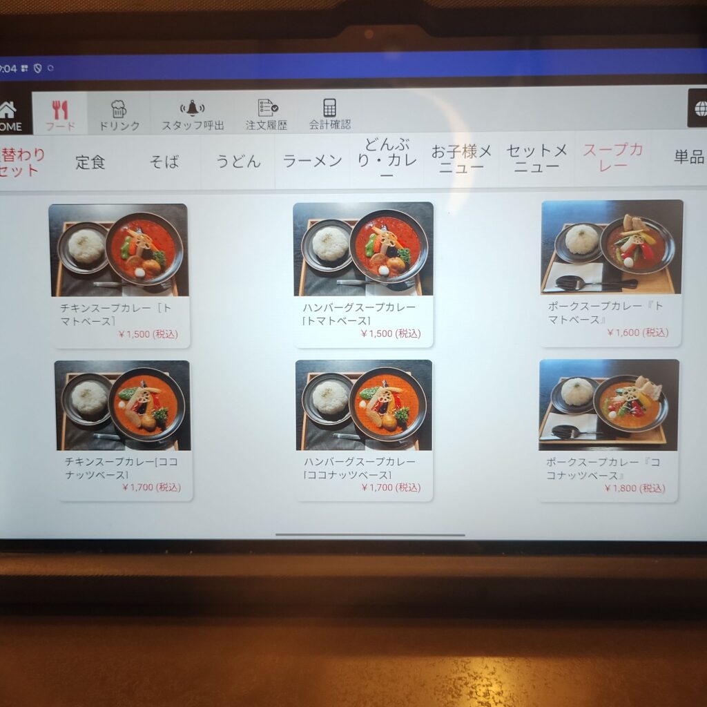 オーダーはもちろんスープカレー。具材は「チキン・ハンバーグ・ポーク」から選べ、カレーは「トマトベース・ココナッツベース」の2種類。今回も前回同様、「ハンバーグスープカレー・トマトベース」をチョイスです。