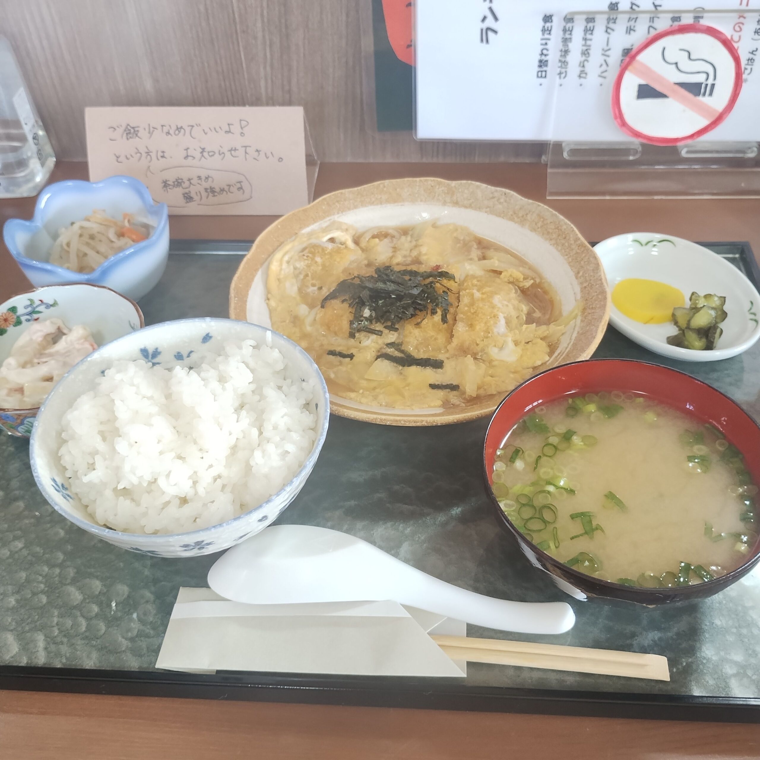 まずは日替わり定食を確認するも、すでに売切。人気ぶりがうかがえます。気を取り直してランチメニューから選んだのは「かつ煮定食」 あまり見かけないメニューですし、今日は少しガッツリいきたい気分でした。