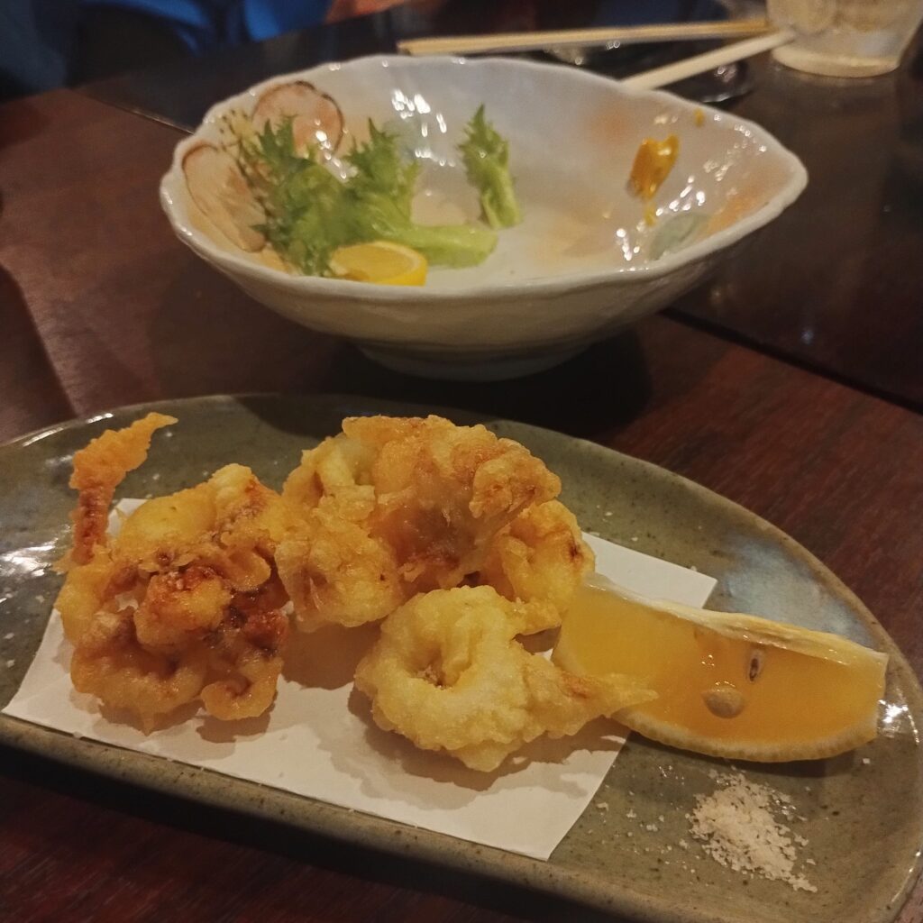 料理は各自好きなものをオーダー。正直、かなり酔っていて詳細はあまり覚えていません(笑) 写真を見返すと、お通しのめかぶから巻物、揚物、刺身までしっかり注文していました。観戦中はフライドポテトのみだったので、相当お腹が空いていたようです。