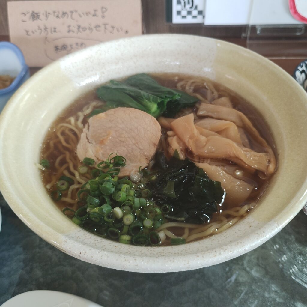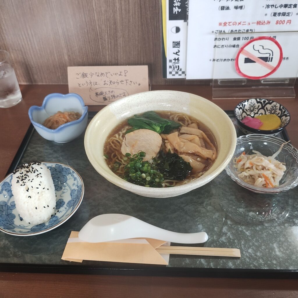この日は無性にラーメンが食べたくなり、「ラーメン定食」をオーダー。スープは醤油を選択。おにぎりは2個まで無料とのことですが、今回は1個に抑えました。