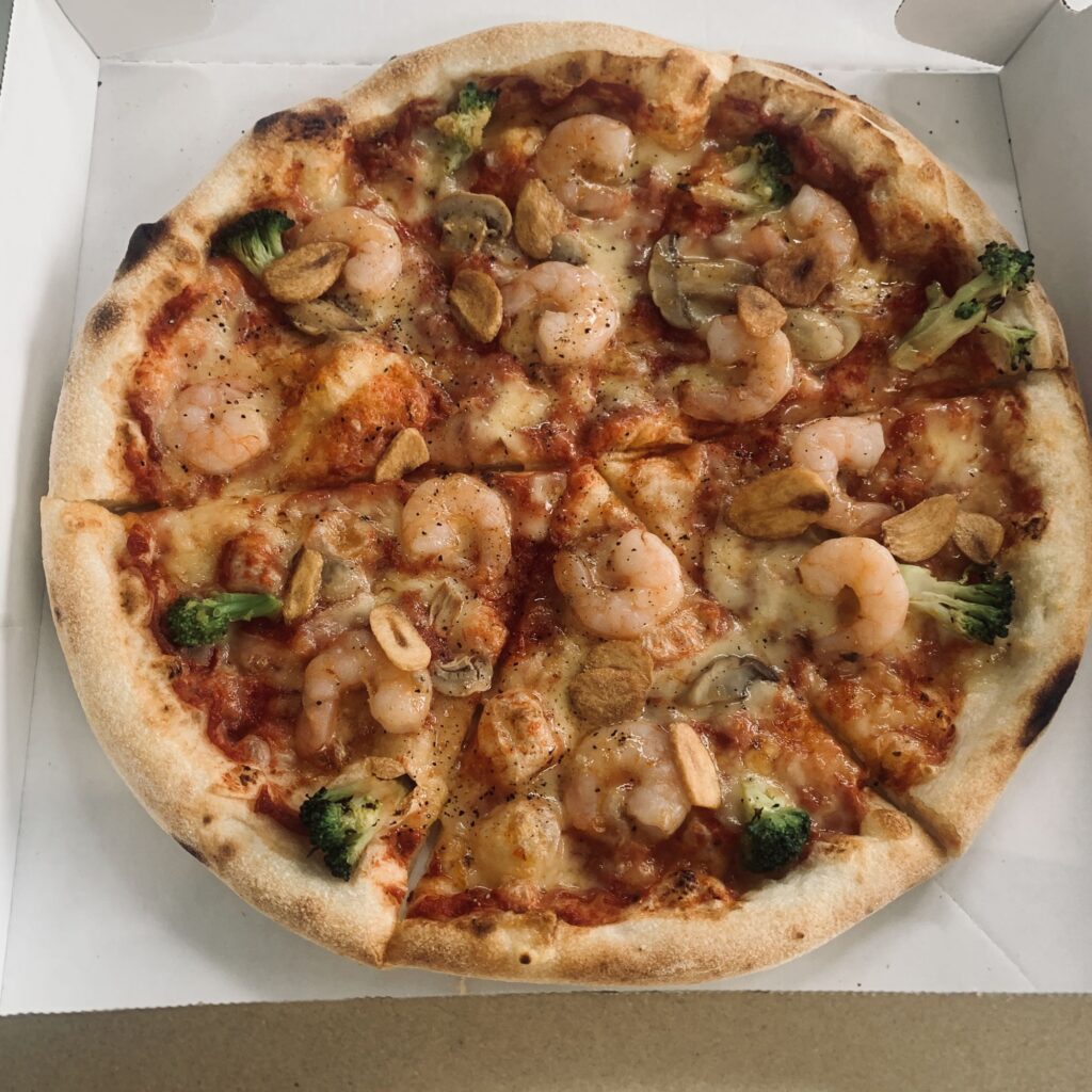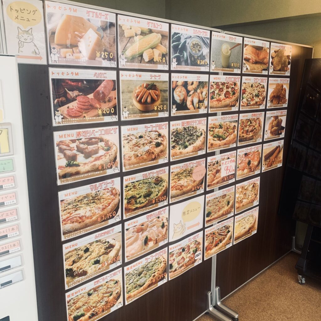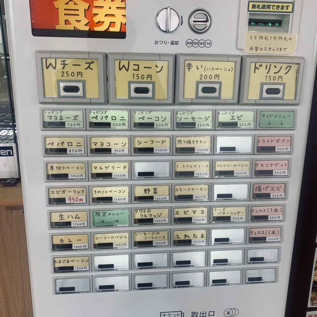 今週のサービスピザは「エビガーリック」 クーポン提示ではなく、食券機の価格がそのままサービス価格になっている分かりやすい仕組みです。訪問時に受取時間を伝え、仕事の合間に再訪する段取りに。
