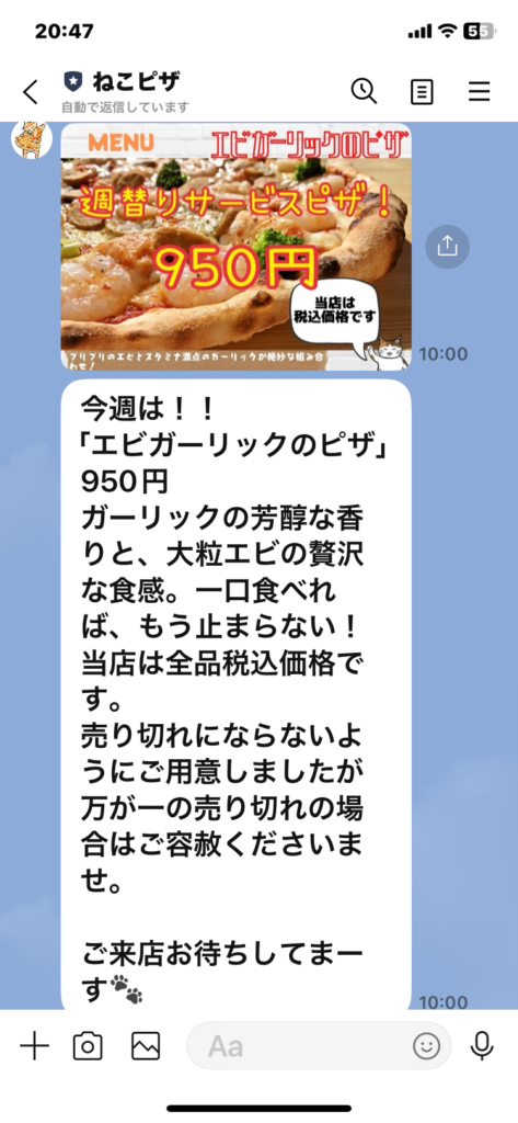 LINEに届いた一通のメッセージ。大仙市朝日町のテイクアウト専門店「ねこピザ」さんからの「週替りサービスピザ」の案内でした。