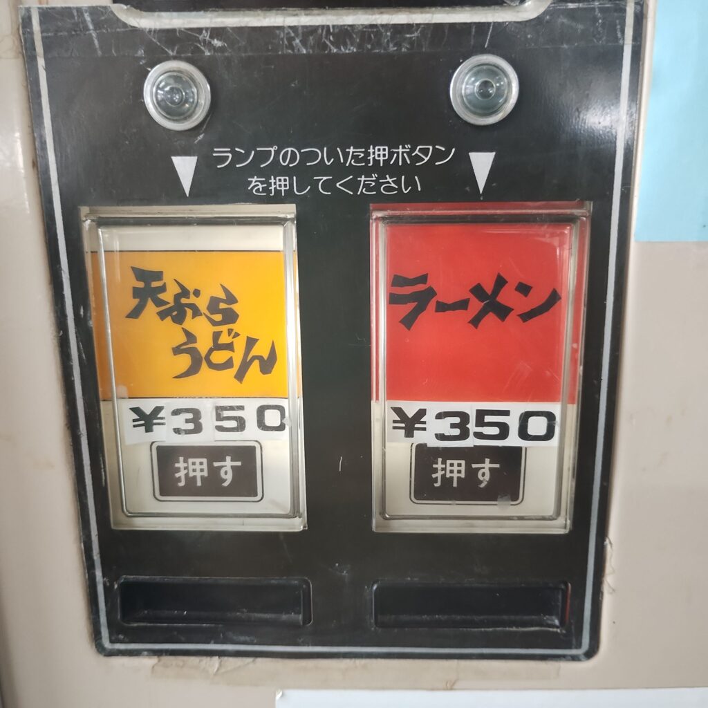 価格は350円。時代の流れで多少の値上がりはあるものの、この雰囲気込みなら納得です。ラーメンと天ぷらうどんの2択から、今回は「天ぷらうどん」を選択。
