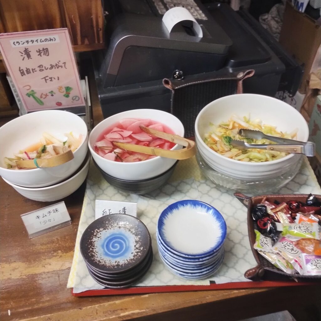 料理を待つ間は、じいじ亭名物のお新香ミニバイキングへ。好きなだけ取れるのが嬉しく、これだけでもちょっと得した気分になります。