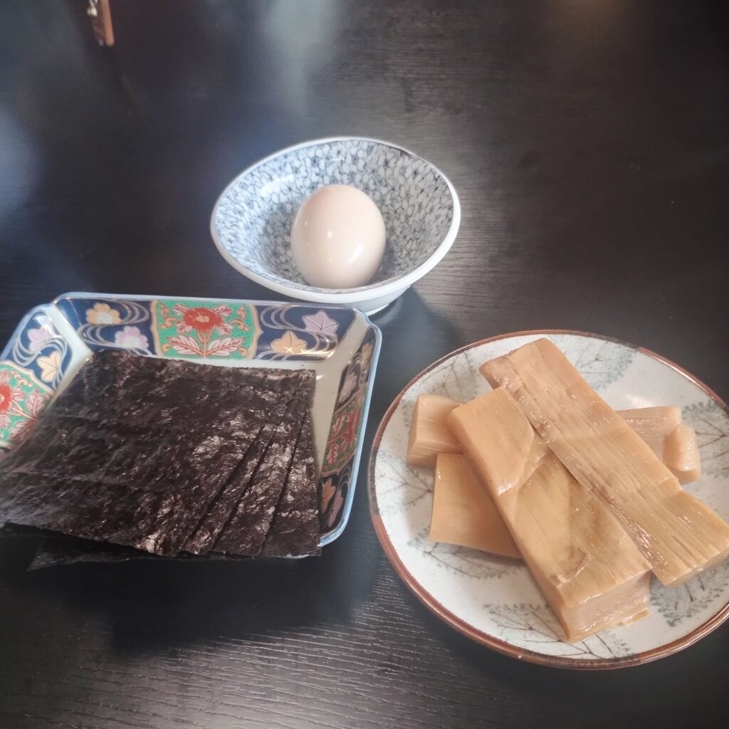 まず登場したのは別皿のトッピング。極太のメンマと海苔がたっぷり。ちなみに味玉は同席の方のオーダーです(笑)