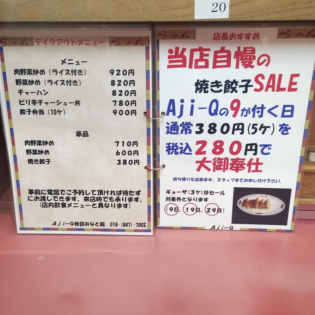 場所は、〒011-0943 秋田県秋田市土崎港南1丁目397に有ります。駐車場は、店舗前に14台ほど。座席は、カウンター6席・8人がけ大テーブル1席・4人がけテーブル3席・小上がり2箇所で4人掛け座卓2卓。営業時間は、11:00〜21:00で無休。
