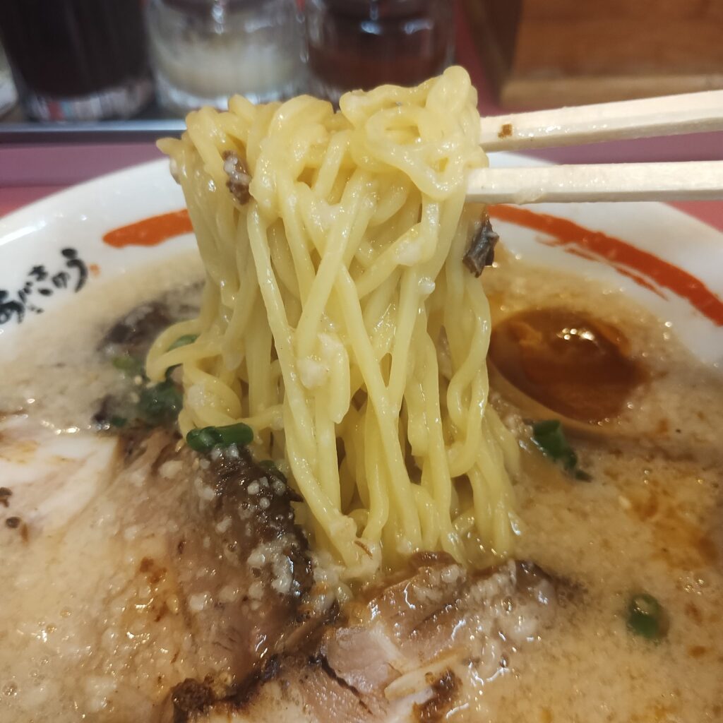 まずはスープを一口。豚骨の旨味と背脂のコクが口いっぱいに広がり、まさに“コク旨”の名にふさわしい濃厚な味わい。いわゆる博多系とは違う、ここでしか味わえないオリジナルの豚骨スープです。