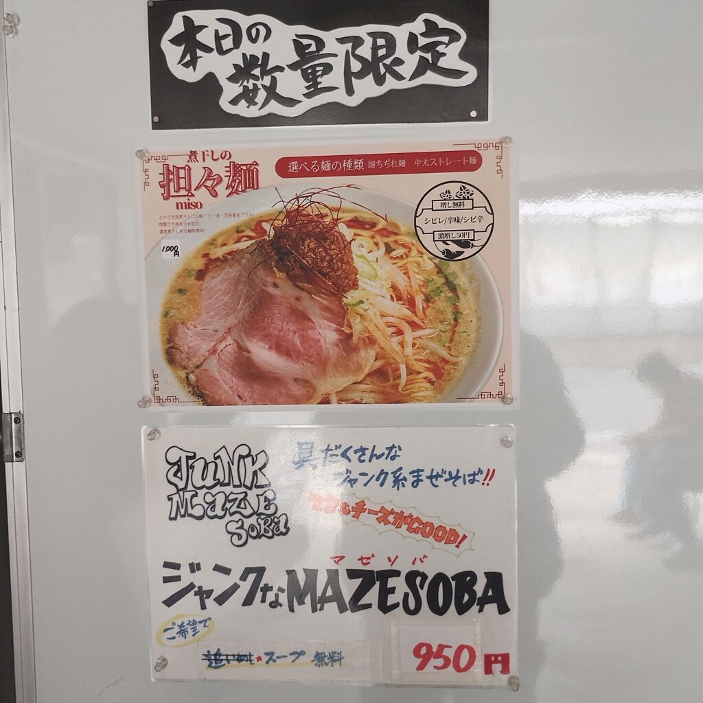 この日は限定で「煮干の担々麺みそ」と「ジャンクなまぜそば」の2種類が登場。事前に決めていた通り、迷わず「ジャンクなまぜそば」を選択しました。