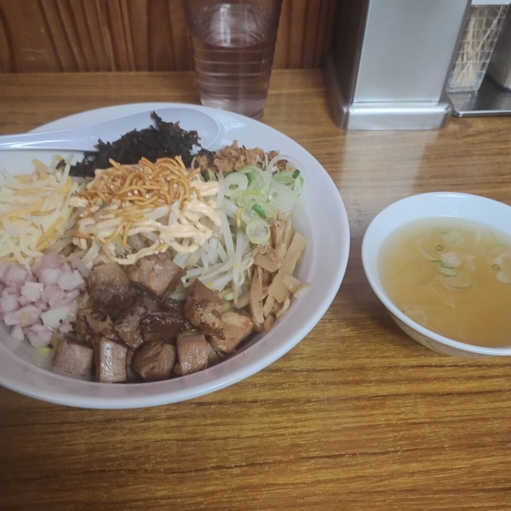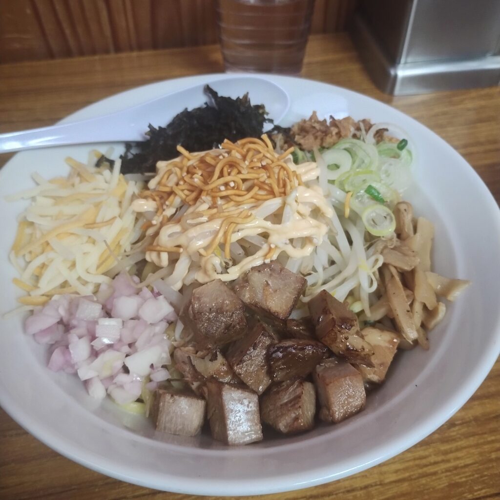 角切りチャーシュー、メンマ、長ネギ、玉ねぎ、モヤシに加え謎肉、2種類のチーズ、磯海苔、マヨネーズ、そしてベビースターラーメン。