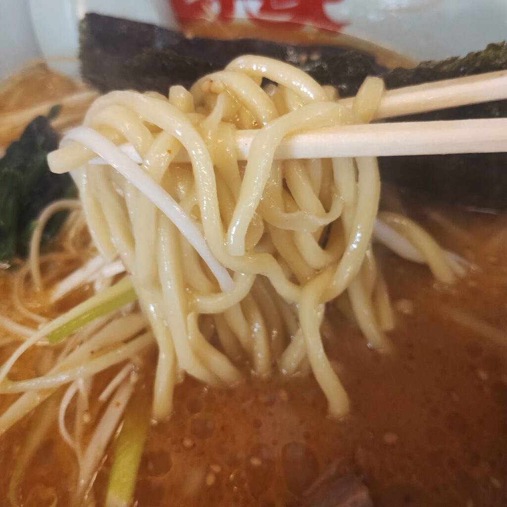 麺は山岡家おなじみの中太ストレート麺。モチモチとした食感としっかりしたコシで、どのスープにも合う万能タイプ。今回の味噌スープとも相性抜群です。